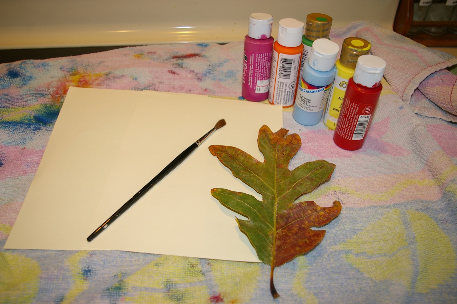 I found a good looking and large leaf, grabbed my paints and a couple piece of card stock and made my first attempt.